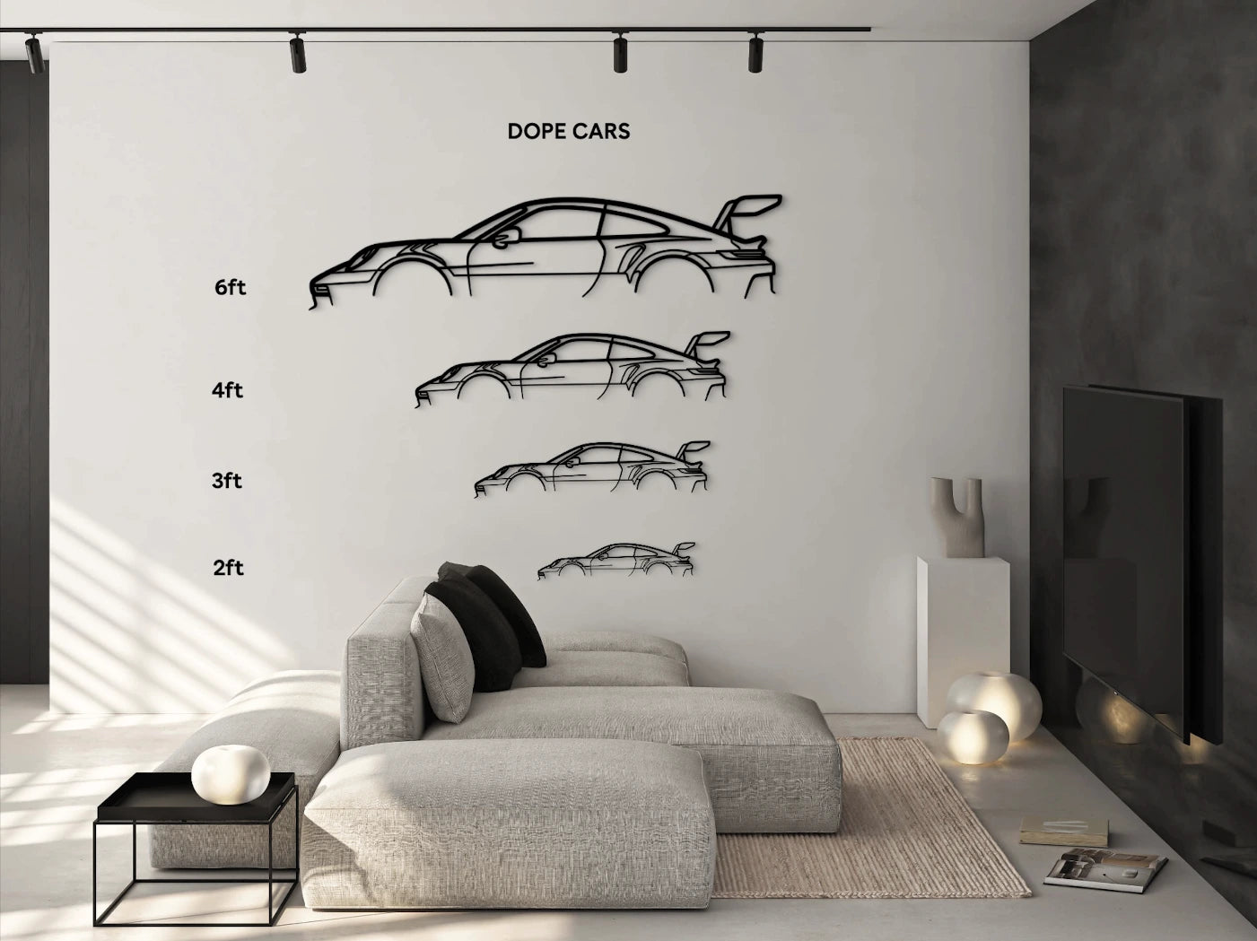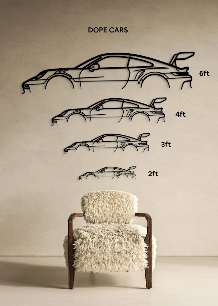 Crafted with meticulous attention to detail, this wall art piece showcases the distinct silhouette of the Porsche 911 GT3 RS. The sleek lines, aerodynamic curves, and prominent rear wing are faithfully reproduced, capturing the dynamic and powerful nature of the car.